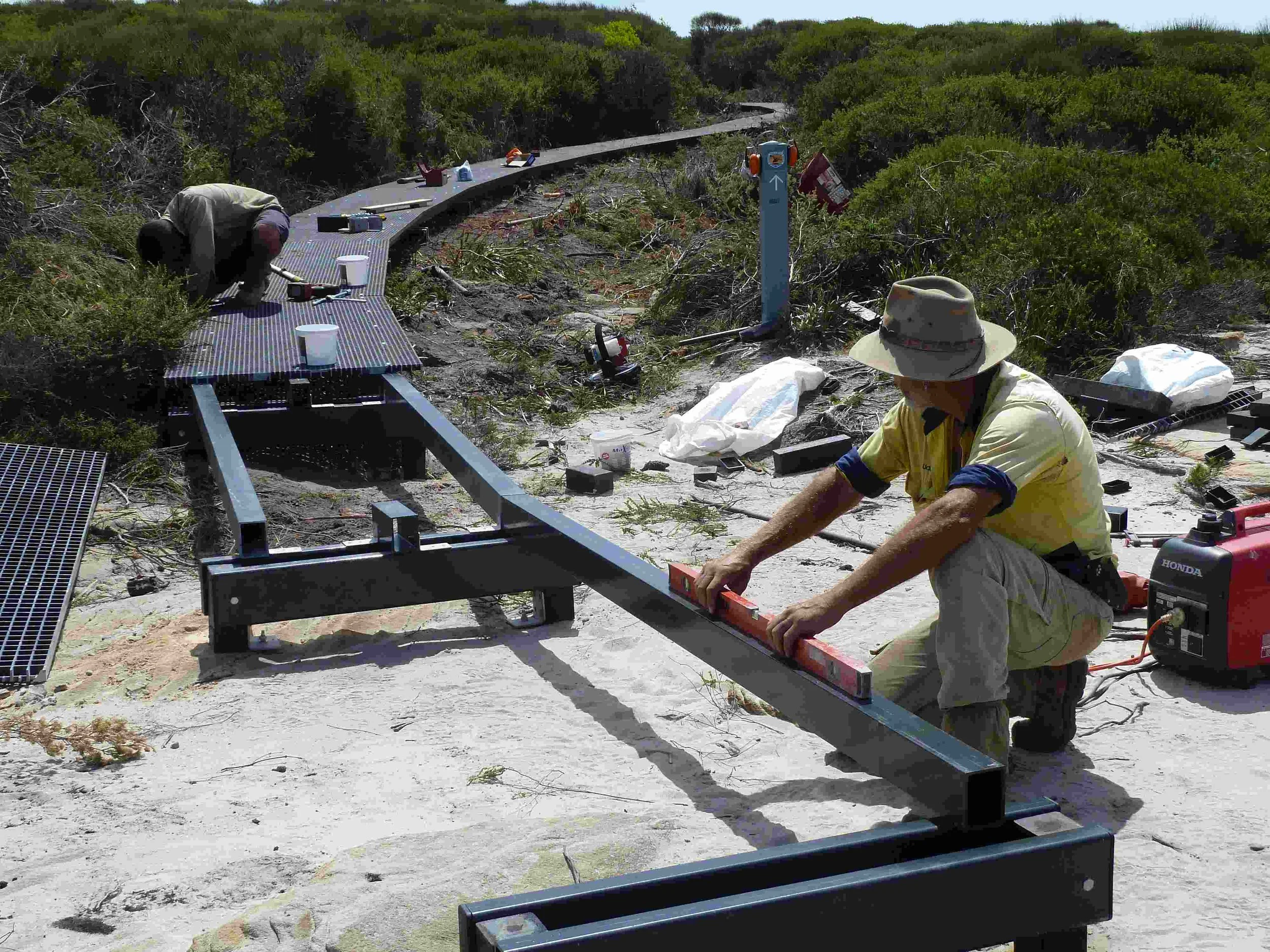 TTMS have installed over ten kilometres of sinuously curving and gently ramping Fibre Glass Reinforced Polymer (FRP) walkways with accompanying overtaking bays and viewing areas.  These walkways have been determined through observation to be one of the few structures that work in the long term to prevent on-going erosion and track widening in these highly erodible sandy soils with heavy walker use.   Prior to TTMS starting at Royal NP a typical walkway would be dead straight with an abrupt change of direction, now the walkways curve through the vegetation to avoid looking down long corridors and steps have been almost entirely eliminated by ramping and curving the walkways up hillsides.
